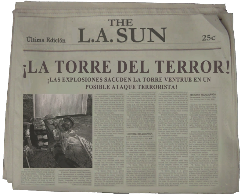 "Un ataque terrorista en Los Ángeles ha causado varios muertos y muchos heridos. El edificio Ventrue fue el objetivo de un asalto a mano armada y con bombas que tiene muy preocupada a la policía ante la probabilidad de que puedan haber más.