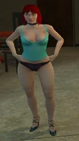 To make herself more appealing, Heather has changed most of her original clothing. She has removed her glasses, changing them for a black choker worn around her neck. She now wears a blue lingerie top, similar in colour to the trim of her tank top, exposing much of her cleavage. In place of pants, she wears dark purple panties, and has replaced her boots with blue high heels.