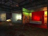 Once at Ground 0, use the key to get through the back door inside the "Employees Only" room. A set of stairs will lead to a hidden studio, whereupon the fledgling will be immediately attacked by the same beasts seen on the horror tape. Move through the studio, being careful not to aggravate too many of the creatures at one time. In the second room, grab two Morphine Bottles – one in the bathroom area and another near the heart-shaped bed. Descend the next flight of stairs, where a man can be seen being killed by one of the creatures behind a window. With a Lockpicking skill of ten or greater, it is possible to enter the room. Otherwise, go through the door at the end of the hall marked "DMP".