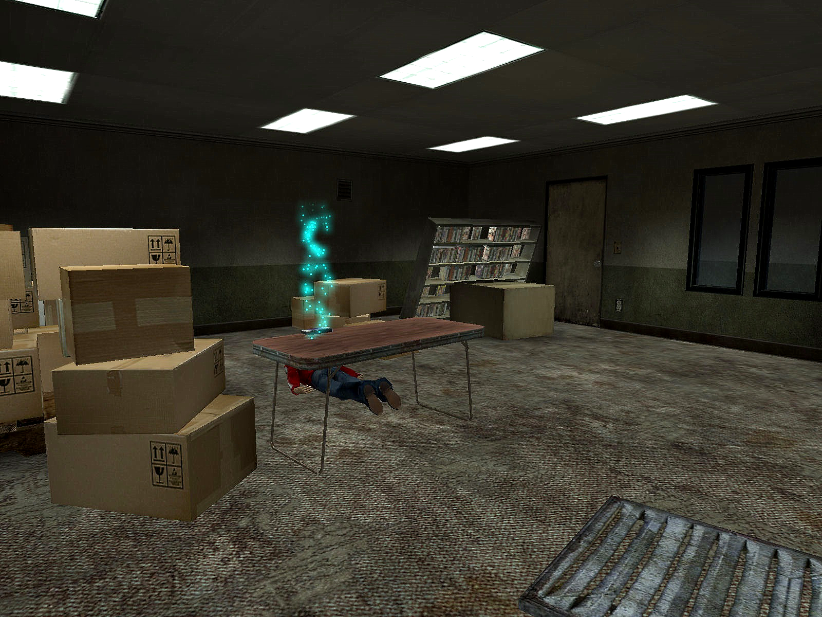 The creatures continue to attack unexpectedly, but press on until reaching a Death Mask Productions employee cowering by some boxes. Talk with him to learn that DMP didn't actually make the snuff film; it was stolen from a "creepy house on the hill" and they simply copied and distributed it. Before he can say much more, though, a creature attacks the man and kills him. The next room offers an alternative way through an air duct into the previous room that was locked down tight. On the table in this room, grab the Horror Tape Part 2 for two points of Experience.